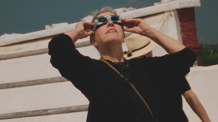Группа людей, преимущественно женщин, наблюдает полное солнечное затмение на крыше бывшего дома ложи Одд Феллоуз в Техасе — тайного общества, которое в XIX веке стало предшественником женской ложи под названием «Ребекки».